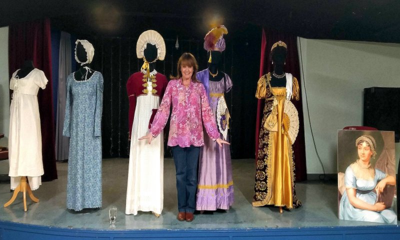 My Regency Talk ‘Enter the World of Jane Austen” is a very interesting, lively, humorous and informative lecture about the design and construction of gowns worn during the Regency period. Beautifully costumed mannequins are dressed in an ornate Court Gown, an afternoon dress with Spencer, a Lilac Ball Gown as well as underwear and accessories.