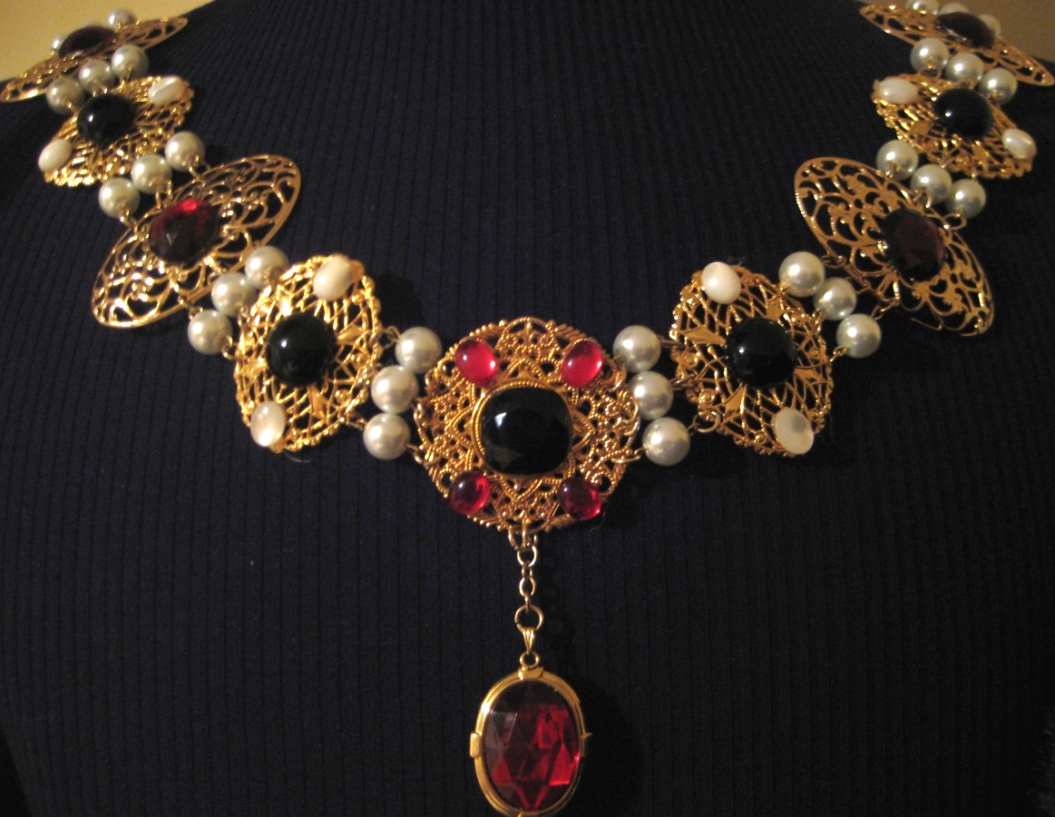 Pictures in the gallery include details of the necklace and bodice of the gown. Other jewellery and accessories worn with this gown include an ornate pearl/jewelled girdle and French hood.