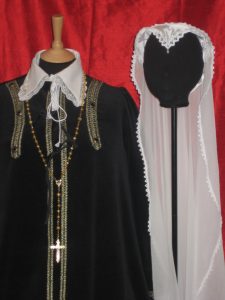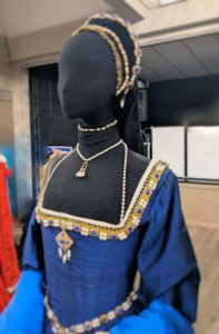 I included a mannequin dressed as Mary Queen of Scots wearing a gown inspired by clothing worn by her for her execution at Fothergay Castle in 1587. I also created Mary’s gold rosary with cross which is currently on display at Jedburgh in the Queens House. As the U3a recently visited this 16th century tower house they were well acquainted with items of Mary Queen of Scots mentioned during my talk!